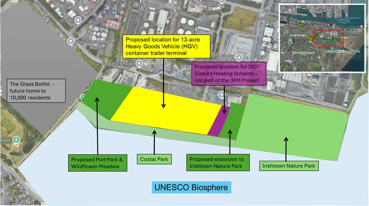 Sandymount residents call on An Bord Pleanála to refuse Dublin Port’s plan to industrialise land beside Dublin Bay’s UNESCO Biosphere Alternative location for trailer terminal needed The Sandymount and Merrion Residents Association (SAMRA) is calling on An Bord Pleanála to refuse planning permission to allow the Dublin Port Company build a 24/7 Heavy Goods Vehicle (HGV) container trailer terminal on a 13-acre site beside Dublin Bay’s UNESCO Biosphere. The call is contained in SAMRA’s 87-page Planning Observation Report submitted to An Bord Pleanála today (24th September 2024) regarding the planning application (ref. PA29N.320250) lodged by the Dublin Port Company in July 2024 for the third part of its €1.1 billion port expansion plan. SAMRA says the area earmarked for the trailer terminal on the south side of the Poolbeg Peninsula is entirely unsuitable for this purpose and an alternative location should be used. The Sandymount and Merrion Residents Association (SAMRA) is calling on An Bord Pleanála to refuse planning permission to allow the Dublin Port Company build a 24/7 Heavy Goods Vehicle (HGV) container trailer terminal on a 13-acre site beside Dublin Bay’s UNESCO Biosphere. The call is contained in SAMRA’s 87-page Planning Observation Report submitted to An Bord Pleanála today (24th September 2024) regarding the planning application (ref. PA29N.320250) lodged by the Dublin Port Company in July 2024 for the third part of its €1.1 billion port expansion plan. SAMRA says the area earmarked for the trailer terminal on the south side of the Poolbeg Peninsula is entirely unsuitable for this purpose and an alternative location should be used.