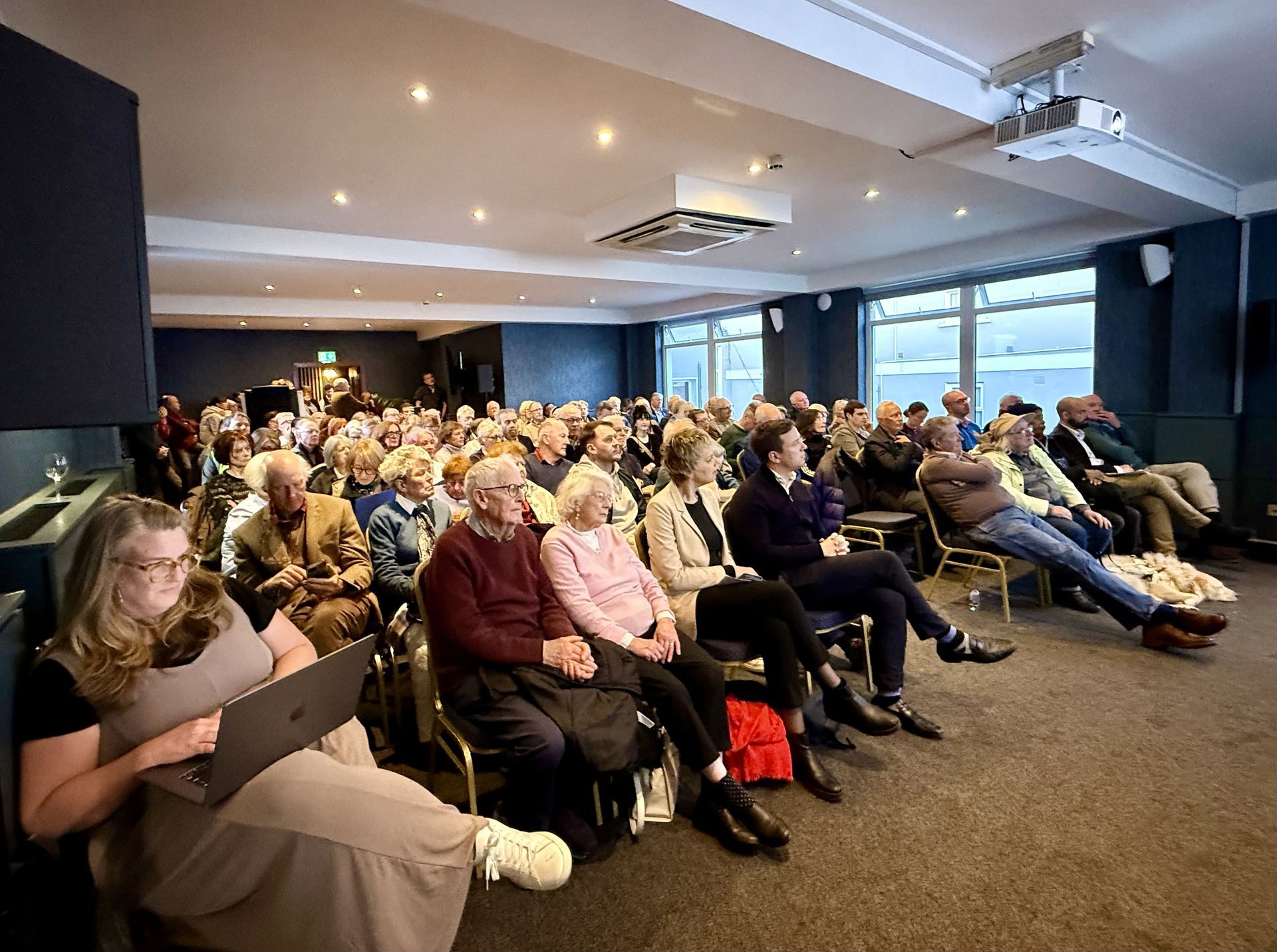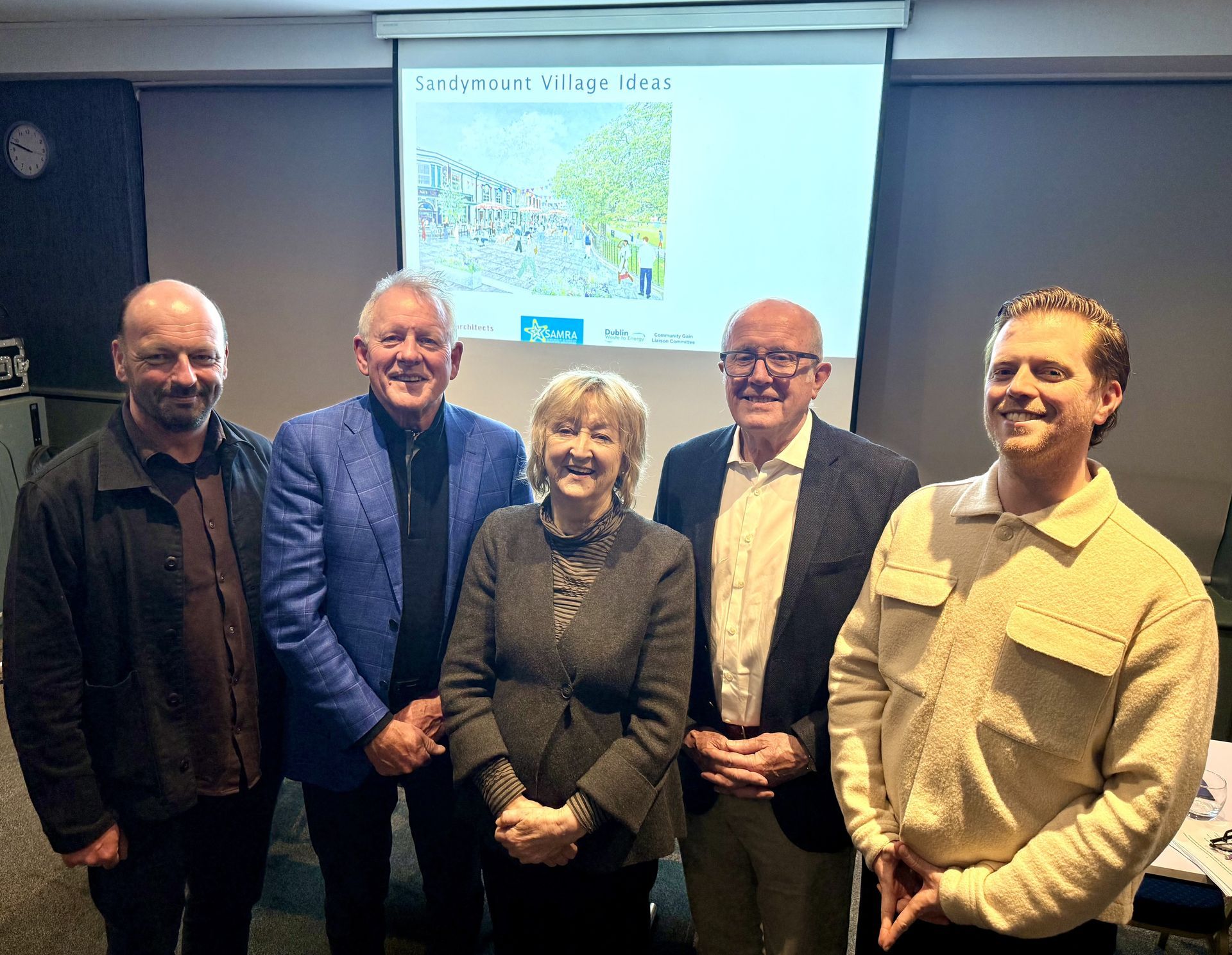 Grafton Architects presented the Village Ideas to the SAMRA AGM on 13th May 2026. (Left to Right) Philippe O'Sullivan (Director Grafton), David Turner (Chair of SAMRA), Yvonne Farrell (Director and Co-founder of Grafton), Niall McElroy (SAMRA's lead on the Village Ideas Project) and Shane Twohig (Project Architect Grafton).