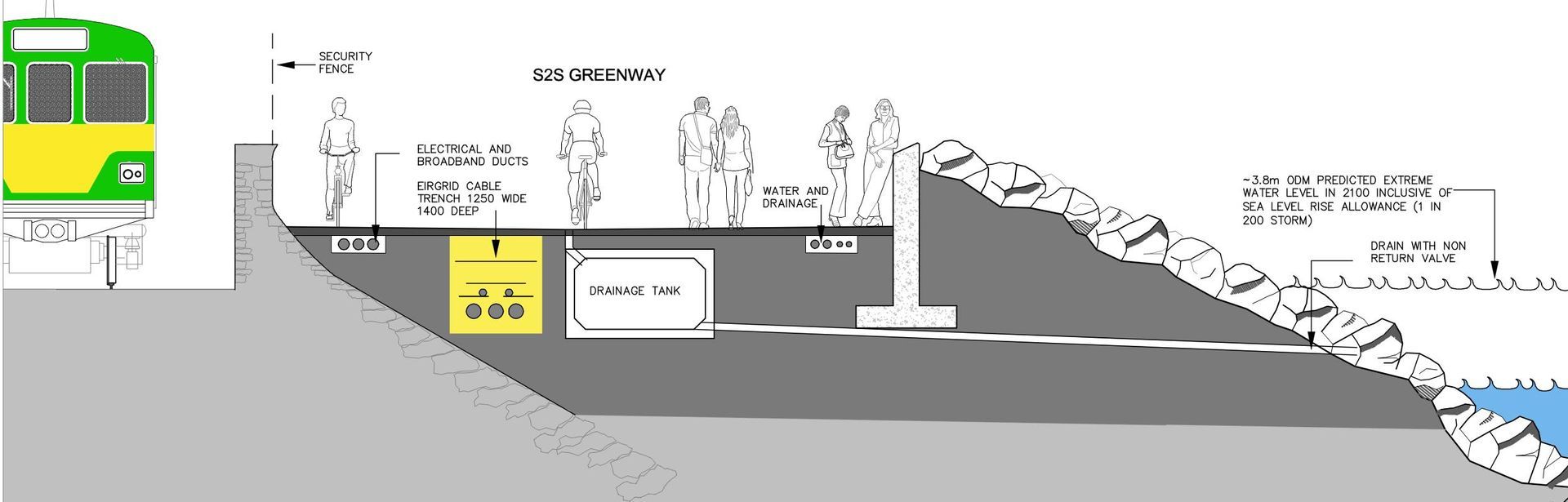- As such, the addition of a cycle and walk way along the rail line as part of the Irish Rail flood defences project would then extend the S2S promenade to Dun Laoghaire, which along with the existing cycle and walk way to Sandycove, would complete the full S2S.